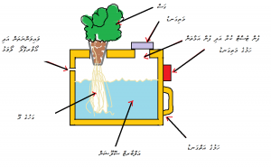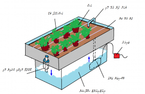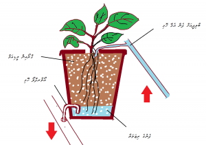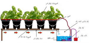 6.5 ޑްރިޕް ސިސްޓަމް: ތިރީގައިވާ ކުރެހުމުގައި ދައްކާފައިވަނީ “ޑަޗް ބަކެޓް ސިސްޓަމް” އެކެވެ. މި ސިސްޓަމްގައި ގަސްތައް އިންދާފައި ހުންނަނީ ބާލިދީ ތަކެއްގައެވެ. ބާލިދީގެ އެތެރެއަށް މަތިން ހޮޅިއަކުން ފެން އެޅެއެވެ. ބާލިދީގެ އަޑީގައި 2 އެލްބޯ ބޭނުންކޮށްގެން ހަދާފައިވާ ހޮޅިގަނޑެއްވެއެވެ. ފެން ހުންނަނީ އެލްބޯ އާއި ހަމައިގައެވެ. އެލްބޯގެ ކޮޅާއި ފުލާދޭތެރޭ އިންޗިއެއް ވަރުގެ ހުސްޖާގަވެއެވެ. އޮހޮރިގެންދާ ފެން ހޮޅިއަކުން ބާލިދީތަކުން ރިޒަވަޔާރ އަށް އެބުރި ދެއެވެ. އެލެކްޓްރޯނިކް ޓައިމަރެއްގެ އެހީގައި ދުވާލަކު 3 ނުވަތަ 4 ފަހަރަށް 30 މިނެޓަށް ސިސްޓަމް ފްލަޑް ކުރެއެވެ. މުނިފޫހިފިލުވަން ގަސް ހައްދާމީހުން ޓޮމާޓޯ، ކިއުކަންބާ އަދި މިރުސްފަދަ ގަސްގަސް މި ސިސްޓަމުގައި ހައްދާ އުޅެއެވެ.