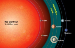 ރެޑް ޖަޔަންޓް ސްޓޭޖްގައި ދުނިޔެއާއި ކައިރި ހިސާބަކަށް އިރު ބޮޑުވެ، އޭގެ އެޓްމޮސްފިޔާގެ ތެރެއަށް ދުނިޔެއާއި މާސް ވަދެފައި. ސޯސް: Astronomy) Roen Kelly)